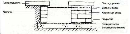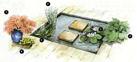Этот квадратный водоем с четкими очертаниями прекрасно вписывается в дворик геометрической формы. Водоем пересекает прерывистая дорожка из бетонных плит, уложенных на кирпичные или бетонные опоры.