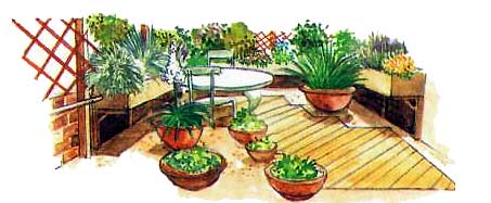 Легкий настил сделан из тонких, обработанных консервантом досок, привинченных шурупами или прибитых гвоздями к брускам, которые уложены прямо на поверхность крыши. Решетчатые панели повторяют рисунок настила. Эти панели частично закреплены на верхней части парапета, а частично — на квадратного сечения столбах, прикрепленных болтами к наружной стене.Чтобы не увеличивать нагрузку на крышу, растения размещены по периметру в лотках из стекловолокна, опирающихся на прикрепленные к стене оцинкованные кронштейны. По-лив растений в лотках, которые, кстати, обязательно должны иметь дренажные отверстия, осуществляется простым устройством, состоящим из проложенной в субстрате перфорированной трубы, куда вода подается самотеком из бака, расположенного в наиболее укрепленном углу садика.