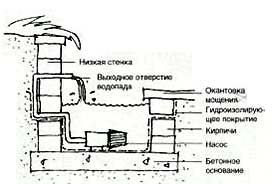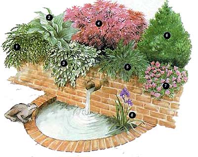 Слабая струйка воды вытекает из старой глиняной трубы в крошечный полукруглый водоем. Вместо трубы в кирпичную стену можно вмонтировать каменную голову льва или какое-либо другое украшение.