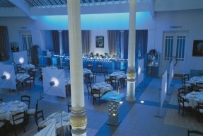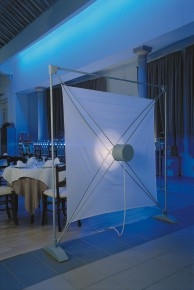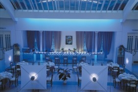 Декор, сотканный светом, — венец идеи минимализма. Разве может осязаемый предмет из тактильного мира соперничать с эфирной легкостью светового луча? Современные точечные источники — встроенные в пол и сфокусированные на квадратах белых тканевых перегородок — мягко воздействуют на присутствующих. Их корректная работа выглядит многократным отражением в интерьерном пространстве подвешенных к потолку и капителям белых светящихся шаров. Комфортностью освещения не исчерпывается функция света в интерьере "Флоренции". Светильники легких мобильных перегородок принимают активное участие в зонировании пространства наряду с изменением цвета и качества напольного покрытия. Полосы голубого кафеля на светлом фоне направляют движение по залу, а окантованные металлическими реями квадраты паркетных островов — территория под столики для клиентов.