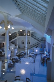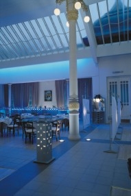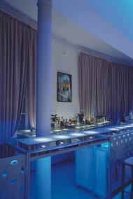 Белые огоньки, затухая, отражаются на боковой поверхности металлической барной стойки, перекликаются с сегментированностью конструкций фонаря в крыше зала. Столешница матового стекла, как прожекторами, прожигается снизу многочисленными световыми пучками. Рассеянный голубой свет, источник которого скрыт между скатом крыши и стеной, заполняет пространство, выступая общим фоном, предоставляя возможность белому свету рисовать свои формы. Голубая подсветка погружает в нейтральность все, что не выделено белым светом, позволяя таким образом чувственно-пластичным формам модерна соседствовать с продуктами технологизма.