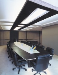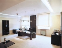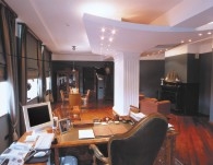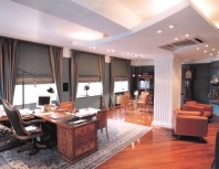 Каким должен быть зал переговоров? — Однозначным! Без признаков вычурного стиля. Без желания удивить. Здесь нет места мелочам и деталям, которые могут отвлечь от того главного, ради чего собрались за этим столом. В этом зале мы решили создать ауру приглушенных цветов и звуков. Ковер на полу, на стенах панели из замши ("Codutti"), стол обтянут кожей ("Mateograssi"). Над столом огромный светильник. Просто и чувствуется мощь. Атакующий стиль. То, что нужно.