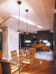 Но мы знаем — в таких случаях "перекраивать" надо кардинально, иначе результата не добиться.Менять пришлось многое. Корректировалась даже планировка. Специалисты знают, как важны выверенные пропорции, как необходимы четкие оси в парадных интерьерах. Ради десяти сантиметров поднимали даже перемычки над всеми дверями.