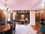 Всю мебель в этом кабинете пришлось заменить. По дизайну идеально подошла "Giemmi" — шикарная и одновременно строгая. Согласно концепции, этот кабинет создавался для самых важных персон. Он является местом, где принимаются жизненно важные решения корпорации. Здесь нет имитаций, все настоящее — бронза, позолота, мрамор.