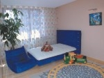 Приватная половина состоит из двух комнат. Детская оформлена в той же бежево-синей гамме. В ней много солнца, тепла и игрушек. Минимум мебели позволяет оставить свободное пространство для игр, так необходимых ребенку.