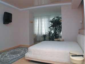 Нежно-абрикосовый оттенок гладких стен определяет настроение, царствующее во владениях Морфея. Мягкий изгиб стены, повторенный потолочным светильником, задает направление и увлекает к занимающей почти всю комнату кровати. Избежать чувства скованности в этой не слишком просторной комнате удалось, применив светлые тона в отделке и натяжной потолок с зеркальным эффектом. Массивный портал ведет из спальни к лоджии, превращенной в зимний сад. На толстых стенах портала — светло-медовые бра, напоминающие натеки смолы.К спальне примыкает ванная комната со встроенными нишами-полочками. На фоне светло-серой и бронзовой мозаики стен с волнообразными изгибами классическая белая сантехника смотрится очень естественно и изящно.