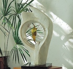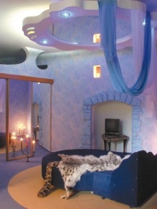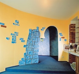 Что касается возникновения решений... Есть разные способы проектирования интерьера. Первый: взять ручку и бумагу и, сидя за столом, выполнить задание. Вторым способом пользуются люди, которые являются посредниками между мировыми энергиями. При создании проектов они обращаются к энергиям, задавая 10 вопросов, и получают 10 ответов. Потом видят результат. Я работаю так же: вхожу в особенное состояние, задаю интересующие меня вопросы и получаю ответы. Однажды так я увидел стену из висящих камней. Свет проникал сквозь камни, разрезая их, пробиваясь через кладку... В голове-то оно висит, а как его повесить в жизни, чтобы производило нужное впечатление: камни висят в воздухе, между ними нет шва кладки... Эта идея реализована здесь. Панно так и называется: "висящие камни".