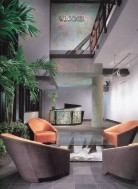 Изумительная лестница ведет отсюда на верхний уровень офиса — в фойе, через остекленную стену которого открывается захватывающая панорама гавани. Недалеко от входа находится элегантная, ярко освещенная гостиная комната с полом голубовато-серого оттенка, перекликающимся с морской водой залива.