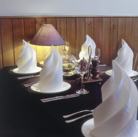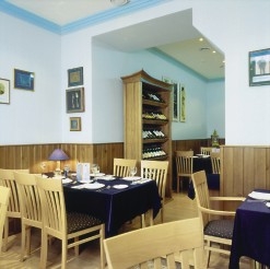 Постепенно проступали общие контуры задуманного "корабля". Бар и барная стойка превратились в уютную "кают-компанию", которая теплм встречает посетителей, спускающихся по стилизованной лестнице. Над барной стойкой нашлось место настоящей корабельной рынде. Картина реальной корабельной обстановки подчеркивается морской формой персонала, мелкими и такими необходимыми в данном случае штрихами: над входом укреплен корабельный штурвал, на стенах ресторана развешены старинные фотографии на морскую тематику.