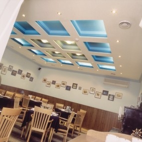 Зрительный акцент зала — большой аквариум, визуально соединяющий зал с баром сквозь просвет в стене. Появление аквариума продиктовано ранее существовавшей планировкой — его удачно разместили в уже существующей нише. У выхода из зала — старинный рояль, а общую морскую стилистику дополняет массивный антикварный шкаф. Зал образно разделен на две части. В той из них, где непрерывно транслируются музыкально-развлекательные программы, отдыхает молодежь и царит непринужденная обстановка. Другая же часть, напротив, более тиха и уютна. VIP-комната — это особая территория, поэтому все нюансы продумывались с особой тщательностью. Результатом явилась комфортабельная "каюта" на шесть персон, в интерьере которой доминируют зеленый и бежевый цвета. Процесс оформления "Титаника" нельзя считать завершенным. Обе стороны — заказчик и творческая группа —вдохновленные идеей и удачным результатом, продолжают привносить в интерьер ресторана все новые детали и уместные мелочи.