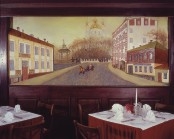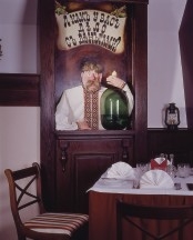 Обитые "заморскими" шелками, они создают атмосферу уединения и комфорта. В каждой кабине — окно с подсветкой, и когда загораются "огни", перед Вами возникает Киев начала ХХ века. На прекрасно выполненных фотографиях Вы видите Андреевскую церковь, узнаете Игоревскую улицу, Гончары, Кожемяки, Дом купеческого собрания (сегодня это Национальная филармония Украины). В нишах на стене удобно устроились яркие куклы — будто ожили колоритные персонажи фильма режиссера В. Иванова "За двома зайцями", поставленного по одноименной пьесе Н. Старицкого: Сирко с огромной сулеей самогона (самого что ни на есть настоящего!), Свирид Петрович Голохвастов и Проня Прокоповна Сиркова… Большую часть стены занимает панорама Андреевского спуска — той его части, где стоит "дом-терем" с Ресторацией. Все это — работы театрального художника Сергея Рябоконя. Росписи стен и городничий под фонарем, встречающий Вас по дороге в купеческий зал — тоже его рук дело.На невысоком подиуме в глубине "Красного зала" стоит столетней давности немецкое пианино. На нем ежедневно играет тапер, и под звуки знаменитого канкана лихо пляшут "танцорки". Рассказывая о ресторане, невозможно не упомянуть о кухне. Успехом у посетителей пользуются борщ по-малороссийски с пампушками, щучка фаршированная, шуба, грибочки, кулебяки, расстегаи… Из напитков — квасы, узвары, медовуха и все прочее. Словом, традиционная старославянская кухня, очень напоминающая домашнюю. Подается все это на фарфоровой посуде, в хрустале, правда, серебро, с которого обычно ели купцы, пришлось заменить мельхиором. Обслуживающий персонал одет в костюмы в духе начала прошлого века по рисункам художника Ольги Коваль.