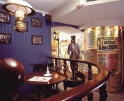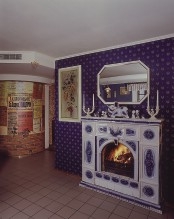 Спустившись по нескольким ступенькам, Вы попадете в "Синий зал" — бар. Центральное место тут занимает камин, созданный на заводе "Коростенский фарфор". Он облицован изразцами, выполненными в технике гжели, характерной для интерьера городского дома начала прошлого века.