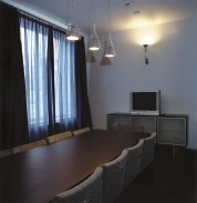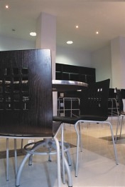 Ощущение целостности внутреннего пространства рождается еще в вестибюле. Единый ансамбль образуют металлические кресла фирмы "Caimi Brevetti" (Италия) в сочетании со стальным карнизом, фурнитурой, портьерами и занавесями, преломление света на изгибах ткани которых зажигает радугу оттенков.