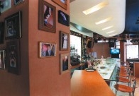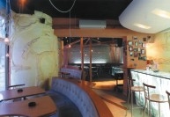 Бежево-золотисто-коричневые тона, мягкий неяркий свет, пластика поверхностей стен, перетекающие волнами группы столиков и диванчиков. За исключением стульев в зале и у барной стойки, вся мебель изготовлена на заказ по эскизам архитектора. В углу напротив входа — небольшое возвышение для диджея со всем обычным набором аппаратуры, зеркальным шаром и крохотным пятачком для любителей потанцевать. Впрочем, его размеры уместны: в "Синей бороде" все небольшое, компактное, рассчитанное на человека.