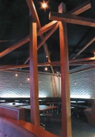 Единый объем зала зонирован массивными пластичными колоннами, которые превращены в барельефные скульптурные существа, кажущиеся сплетениями живых тел. Они излучают тепло, и невольно хочется протянуть ладонь, чтобы прикоснуться к их гладкой поверхности, как бы выточенной из слоновой кости. Каждая колонна — центр объединенного вокруг нее пространства, которое размещено на гладком светло-бежевом полу, инкрустированном вставками из мощеного дерева, напоминающими рассыпанные паркетины.
