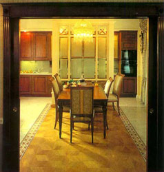 Самое элементарное зонирование пространства кухни и столовой - пол, который является неотъемлемой частью дизайна кухни. Переход из активной зоны в обеденную должен быть продуман особенно тщательно, чтобы каждая зона выглядела естественным продолжением интерьера. Относительно напольного покрытия (об основных его видах мы уже писали) откровенного диктата не существует. Интересные художественные и в то же время практичные решения дает комбинация материалов. Например, если в качестве основного покрытия выбирается паркет, то в рабочей зоне пол выкладывается плиткой или керамогранитом. Если выбирается один материал, то зоны визуально подчеркиваются рисунком пола или цветом.