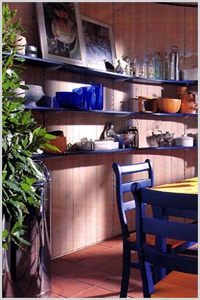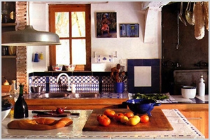 Прежде всего, это матовые, фактурные поверхности с эффектом рукотворности. В "итальянском доме" могут сочетаться несколько фактур на одной стене одновременно: мозаичная плитка, декоративная штукатурка, настенная живопись (роспись) имитация фресок. Мозаичная плитка "терраццо" выложенная в виде изящного панно на стене (цоколь или фартук) может плавно перейти на пол. При окрашивании стен можно использовать технику нанесения краски несколькими слоями, родственными по цветовому спектру цветами. Например, золотистая охра и терракотовый. Это усложнит восприятие помещения, сделает его более интересным и создаст эффект игры солнечного света. В "греческом" интерьере основа - белые стены. Деревянные панели, выкрашенные определенным способом словно ветер, солнце и море проверяли покрытие на прочность - внесут обаяние "греческого" средиземноморья. Грубая фактурная штукатурка придаст рустикальную простоту вашему интерьеру и создаст необходимый рукотворный шарм. Если у вас неровные стены, то в данном случае это будет плюсом и позволит немного съэкомонить времени, сил и финансов. Уместно использования кирпича, но в небольших количествах, для камина или стены вокруг кухни. Мило и стильно смотрится облицованная столешница кухонного гарнитура и фартук, единой плиткой небольшого формата. Керамическая плитка с неровными краями или расписанная вручную будет "изюминкой" вашей кухни.