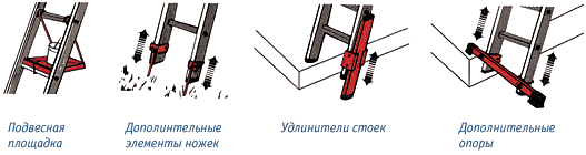 Дополнительные опоры. Увеличивают ширину ножек стремянки и придают ей большую устойчивость. Крепятся с помощью двух скоб с винтовыми зажимами. Снабжены резиновыми или пластиковыми насадками, которые не дают стремянке скользить.