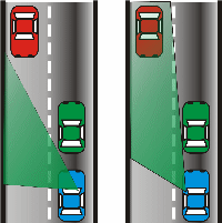 На правой фотографии приведена типичная ситуация: впереди едет «Фургон», но при этом не видно, что находится на встречной полосе. Однако, на фотографии слева, в зеркале перископической системы отчетливо видно, что перед «Фургоном» находится «девятка», а по встречной полосе едет машина. И для того, чтобы это увидеть, не нужно постоянно «выскакивать» на встречную полосу, принимая сильно влево. Достаточно одного взгляда в сторону зеркала данной перископической системы.
