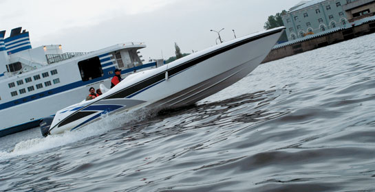 К моменту презентации Sea Dragon на "Бот Шоу Петербург – 2005" двигатели Yamaha еще не успели пройти обкатку, поэтому раскочегарить катер до "максималки" никто даже и не пробовал – моторы нельзя было крутить выше 3 000 об/мин. Но даже на неполном газу лодка летит со скоростью под 80 км/ч – показатель, недостижимый для большинства моторных лодок и яхт. При этом, как утверждают представители компании, Дракон легок в управлении и послушен до чрезвычайности. Насколько я успел заметить, здесь очень легкое рулевое, но при этом руль делает огромное количество оборотов – более восьми от упора до упора!