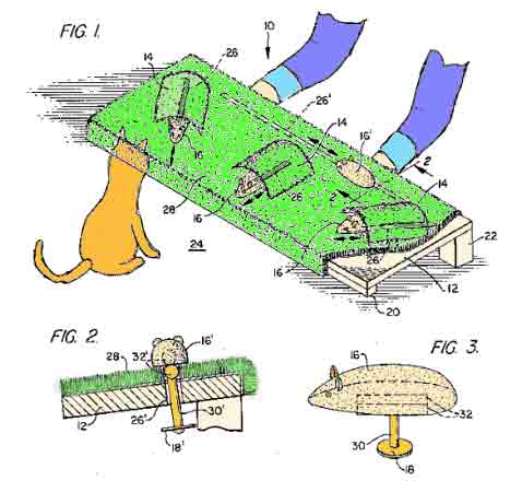 Идея проста и заслуживает внимания директора какого-нибудь парка развлечений или массовика-затейника. За кота могут играть дети с колотушками, вместо мышей можно смастерить фигурки барсуков или людей. Соответственно, игру можно переименовать в bin Laden Puppet (тогда патент был бы выдан в 2001 году).