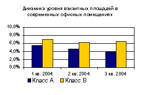 Ставки арендной платы. В 3 квартале 2004 года рост средневзвешенной арендной ставки в классе "А" составил 2 % и, в большей степени, был обусловлен ростом операционных расходов, тогда как средневзвешенная арендная ставка в классе "B" понизилась на 6 %, продемонстрировав необоснованность высокого роста в прошлом квартале.