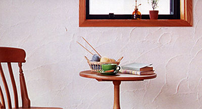 Материал наносится на поверхность кистью крестообразными движениями. При нанесении материала добивайтесь равномерного распределения белых частичек по поверхности. Лучше всего наносить краску сверху вниз, чтобы избежать попадания осыпающихся частичек на готовую поверхность. Сразу после нанесения нужно пригладить специальным мягким пластиковым шпателем белые включения. Работая шпателем, не прикладывайте больших усилий.