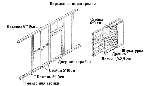 Каркас перегородок состоит из стоек толщиной 5-6 см и шириной 9-10 см с шипами на концах, верхней и нижней обвя-зок такого же сечения с гнездами для шипов стоек. Стойки ставят на расстоянии 0,75-1,2 м одна от другой, шипом в гнездо обвязок, и скрепляют гвоздями. Для образования дверного проема ставят обрамляющие стойки с врезанным сверху ригелем (перемычкой). Дверную коробку прибивают к обрамляющим стойкам гвоздями. Каркас обшивают горизонтально с двух сторон досками толщиной 1,9-2,5 см. Доски шириной более 12 см надкалывают топором, для того чтобы они не коробились при оштукатуривании. Пустоты между двумя обшивками засыпают мелким просеянным сухим шлаком для увеличения звуконепроницаемости и уменьшения пожароопасности. Каркас может быть обшит также листами гипрока. В ряде случаев каркас междукомнатной перегородки может быть обшит древесно-волокнистыми плитами и листами фанеры без всякого заполнения. Однако такие перегородки, будучи очень легкими и простыми по своему устройству, обладают большой звукопроводностью.