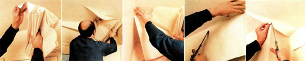 Если вы наклеиваете обои в одиночку вам пригодится способ укладки обоев в "гармошку". Обойный клей или клейстер густо наносят широкой кистью сначала на середину полотнища, затем аккуратно распределяют по всей поверхности. Слой клея на потолочных обоях должен быть равномерным. Дополнительное его нанесение всегда довольно проблематично. Промазанное клеем полотно осторожно складывают. Начиная с торцевой стороны, делают складки глубиной примерно 30 см так, чтобы один слой клея соприкасался с другим. Получившаяся "гармошка" заканчивается полосой шириной тоже 30 см. С нее вы и начнете приклеивать полотно к потолку, постепенно раскладывая "гармошку". Сложенное таким способом полотно оставляют на несколько минут, для того чтобы клейстер впитался в бумагу и она стала более податливой (за это время можно нанести клейстер еще на три-четыре полотна). Однако следите за тем, чтобы бумага не стала излишне мягкой, иначе она легко порвется.