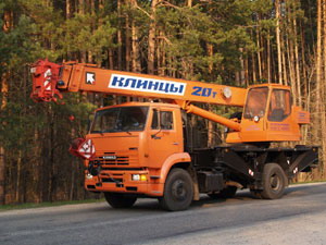 Строительная отрасль испытывает большую потребность в технике, имеющей высокую производительность, хорошую устойчивость, маневренность для работы в стесненных городских условиях. В 2006 году на рынке была представлена новая модель автомобильного стрелового крана - КС-45719-8А "Клинцы". Кран стреловой автомобильный КС-45719-8А "Клинцы" грузоподъемностью 20 тонн предназначен для погрузочно-разгрузочных и строительно-монтажных работ на рассредоточенных объектах. Крановая установка смонтирована на двухосном шасси автомобиля КамАЗ 53605. Благодаря малым транспортным габаритам и отличной маневренности, кран в первую очередь предназначен для использования в стесненных условиях современных городов, где он может передвигаться в плотных транспортных потоках. Привод крановой установки осуществляется посредством аксиально-поршневого гидронасоса, который приводится во вращение двигателем базового автомобиля через коробку передач и дополнительную коробку отбора мощности. Крановые механизмы имеют индивидуальный привод с независимым управлением от гидромоторов и гидроцилиндров. Гидравлическая система крановой установки обеспечивает плавное управление всеми механизмами в широком диапазоне регулирования скоростей рабочих операций, обеспечивая возможность одновременного совмещения нескольких крановых операций. Безопасную работу крана обеспечивает комплекс специальных приборов и устройств, в том числе микропроцессорный ограничитель грузоподъемности с координатной защитой, который автоматически защищает кран от перегрузки и опрокидывания, ограничивает перемещение подвижной части крана в заданной рабочей зоне (работа в стесненных условиях или вблизи линий электропередач), выдает информацию о работе крана на дисплей в кабине машиниста. Ограничитель грузоподъемности имеет встроенный прибор фиксации параметров - "черный ящик" и встроенный модуль защиты крана от опасного напряжения (МЗОН) для работы вблизи линий электропередач. Кран оснащен трехсекционной телескопической стрелой длиной 9-21 метр, которая во втянутом положении обеспечивает компактность и маневренность при переездах, а в выдвинутом - обширную зону и большую высоту перемещения груза при работе. Система телескопирования стрелы включает в себя один гидроцилиндр выдвижения и канатный полиспаст. Дополнительное оснащение стрелы решетчатым гуськом длиной 7,5 метров с возможностью установки под углом 0° и 30° по отношению к стреле позволяет обеспечить наибольшую зону обслуживания и размер подстрелового пространства. Максимальный размер опорного контура (5,25 х 5,8) достигается за счет применения конструкции выносных опор с откидными опорными балками. Благодаря такому решению, кран получает возможность производить работы с грузами в круговой зоне 360?, что позволяет минимизировать количество перестановок при работе на объекте. Возможность телескопирования стрелы с грузом на крюке массой до 6 тонн (что почти в 2 раза превосходит показатели 25-тонных кранов) позволяет крану выполнять специальные задания: устанавливать грузы в труднодоступных местах, проносить их среди смонтированных конструкций. Удобство управления крановыми операциями достигается и за счет оригинального расположения рычагов управления. Надежную работу автокрана обеспечивают импортные комплек