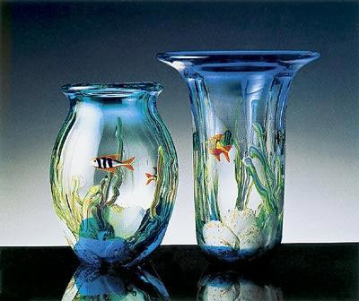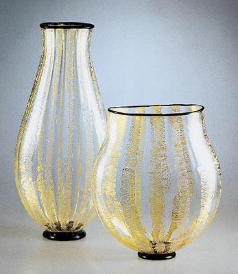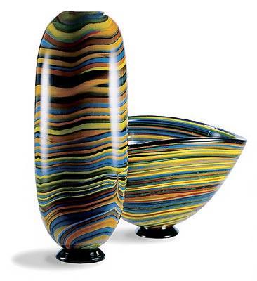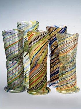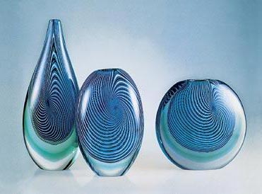 Стеклянная пряжа Техника "стеклянной пряжи": на предварительно подготовленную стеклянную форму наматывается нить из стекла другого цвета или другой прозрачности. Узоры из этой нити могут быть разными и образовывать сетку (ретичелльское стекло), прочесанные нити (эффект перьев) или опаловые спирали (филигрань). На острове Мурано в Венеции была разработана еще одна модификация этой техники - миллефиори ("тысяча цветов"). В стеклянную поверхность заплавляются мелкие стеклянные пластинки или трубочки, образующие цветы (отсюда название). При этом прозрачные пузырьки вдуваются в материал с помощью тонких полых иголок (по принципу шприца), а прозрачные сверкающие нити образует особым образом закачанный в стекломассу воздух.