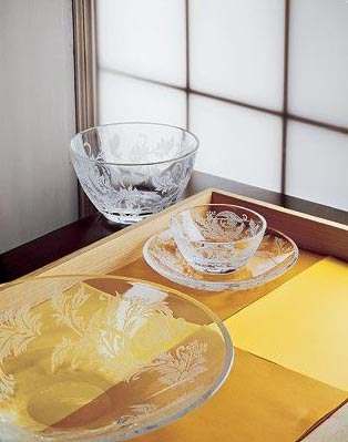 Травление или сатинирование Эту технологию начали использовать в 1771 году с открытием плавиковой кислоты. Сама эта кислота делает стекло блестящим, а ее газы - матовым. Травить можно всю поверхность полностью (при этом она остается гладкой и шелковистой) или выборочно (только рисунок).