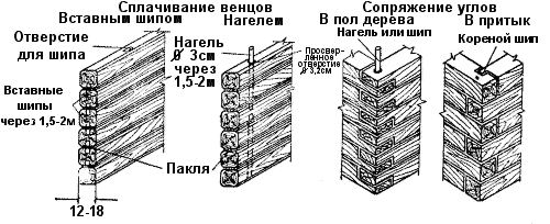 Брусчатые стены по сравнению с бревенчатыми значительно выгоднее с точки зрения затрат рабочей силы и более полноценного использования древесины, так как горбыль от опиловки бревен так-же идет в дело. Для наружных стен употребляют брусья толщиной до 18 см, для внутренних - 10 см; высота брусьев для наружных и внутренних стен должна быть одинаковой, чтобы обеспечить правильное выполнение угловых и поперечных соединений венцов. Швы утепляют так же, как и в бревенчатых стенах. Углы стен рубят без остатка в простую лапу, применяя шипы. В целях защиты от продувания и промерзания углы закрывают снаружи дощатыми пилястрами, под которые следует прокладывать антисептированный войлок. Таким же образом обрабатывают торцы брусьев внутренних стен, выходящих наружу. Сопряжение внутренних стен с наружными осуществляют сквозными замками. Брусья (венцы) по высоте скрепляют шипами или нагелями так же, как и бревна.