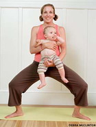 Многим нравятся приседания на широко расставленных ногах: ноги расставьте широко, ступни разверните носками в разные стороны, колени согните. Ребенка можно держать в разных положениях. По мере того, как ребенок подрастает, можно использовать эту позицию, чтобы помочь ему научиться стоять. Эта поза хорошо переходит в Прасарита Падоттанасану: наклонитесь вперед и сцепите пальцы.