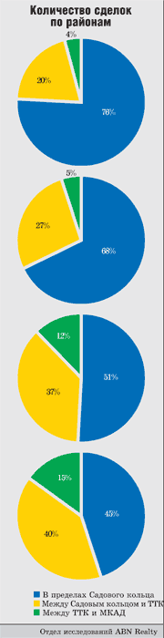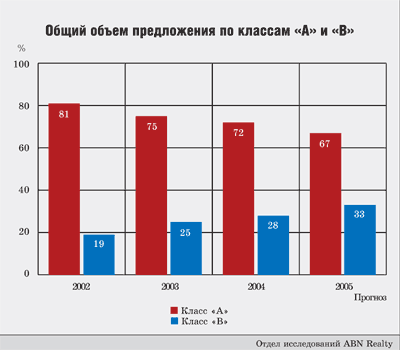 На рубеже 2002–2003 годов ярко выраженные деловые районы города располагались внутри Садового кольца и на прилегающих к нему территориях, редко приближаясь к Третьему транспортному кольцу (ТТК). Для зданий класса «А» важное значение имеет наличие сформированной бизнессреды, однако в тот период ее фактически не существовало за пределами центральных районов. Даже очень качественное здание, построенное в периферийном районе, не смогло бы окупиться — спроса на районы вне центра почти не было. В 2002 году 76 % сделок было совершено по офисам внутри Садового кольца, а разница в ценах между центром и периферией была гораздо значительнее, чем сегодня. К тому же существовавший тогда объем предложения по качественным площадям вполне помещался в пределах центральных районов. Однако за последние два года рынок офисов сделал значительный шаг вперед в количественном и качественном отношениях. Общий объем предложения значительно увеличился, и в пределах Садового кольца появился дефицит земельных участков и зданий под реконструкцию.