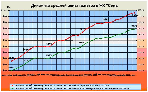 Сегмент малоэтажных жилых комплексов в ценовом отношении столь же динамичен, как и другие сегменты рынка жилья Московского региона. В качестве иллюстрации, мы приводим график динамики цен предложения в ЖК «Семь звёзд» (подробное описание данного комплекса приведено в отдельном разделе) с момента начала продаж и прогнозом до конца 2005 года.