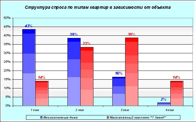 Как видно на Диаграмме, для многоэтажных домов в Подмосковье характерно преобладание спроса на небольшие квартиры – одно и двухкомнатные, в совокупности покрывающие 82% от спроса. Для малоэтажных комплексов характерно более равномерное распределение спроса по типам квартир, с большим упором на середину – двух-трехкомнатные квартиры (в совокупности, 72% от спроса). При этом, следует учитывать, что в малоэтажных комплексах, по сравнению с многоквартирными домами, площади квартир одного типа на 10-30% больше: например, средняя площадь двухкомнатной квартиры в многоквартирном доме составляет 55-65 кв.м, а в малоэтажном комплексе 75-90 кв.м.