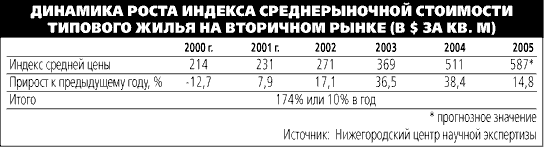 По данным Нижегородского центра научной экспертизы, индекс средней рыночной стоимости 1 кв. м. типового жилья в 2005 г. увеличился по сравнению с предыдущим годом почти на 15% и может составить к концу года около $600. По их подсчетам, рост стоимости недвижимости с 2000 по 2005 г. был равен 174%. Жилой фонд Нижнего Новгорода, по данным городской администрации, составляет почти 26 млн кв. м.