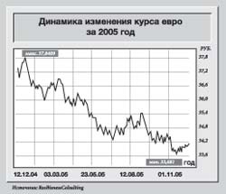 Инвесторы, которые избавлялись от валюты в середине года, не дожидаясь декабря, имели шанс подгадать удобный момент и выиграть. Особенно удачным моментом для доллара был летний период, когда евро резко обесценился после провала Европейской конституции, и осенний – после погромов во французской столице. Имели шанс немного выиграть и те, кто купил евро в начале года и продал их в первой декаде марта. В это время произошло единственное повышение курса евро за весь год на уровень, превышающий январские показатели.