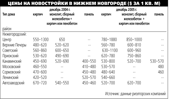 По планам городской администрации в 2005 г. предполагалось построить 430 000 кв. м жилья – на 65 000 кв. м больше, чем в 2004 г. Официальные итоги еще не оглашены, но опрошенные “Ведомостями” эксперты утверждают, что реальные объемы строительства далеки от запланированных и будут ниже, чем в 2004 г. По подсчетам Нижегородского центра научной экспертизы (НЦНЭ), в 2005 г. сдано около 300 000 кв. м жилья. Цены на первичном рынке, по данным того же источника, за год выросли примерно на 18–20%.