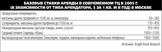 Оборот розничной торговли в Москве, по данным Департамента потребительского рынка, в 2005 г. превысил 1,5 трлн руб. По данным Knight Frank, общий объем предложения торговых центров современного формата достиг в прошлом году 2,9 млн кв. м, увеличившись на 530 000 кв. м. Четыре наиболее крупных ТЦ – почти 56% общего предложения 2005 г. – были введены в спальных районах ЗАО и ЮЗАО. Средний уровень арендных ставок в торговых центрах, утверждают аналитики Noble Gibbons/CB Richard Ellis (NG/CBRE), держится на уровне $600–800 за 1 кв. м в год (без НДС). Самые низкие ставки в $150–300 у якорных операторов; больше всех, до $3700 за 1 кв. м в год, платят мелкие арендаторы, занимающие площади до 10 кв. м. Средний уровень вакантных площадей в качественных торговых центрах в 2005 г. составил 0,7%, утверждают аналитики Сushman & Wakefield/Stiles & Riabokobylko (СW/SR). В 2006 г., по их прогнозам, он также не превысит 1%.