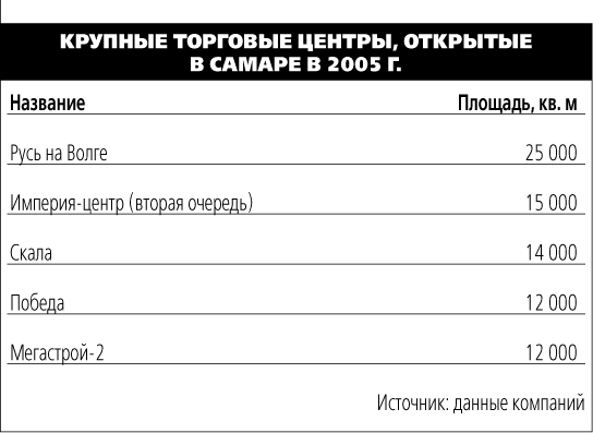 Антипов отнес к ярким проектам прошлого года вторую очередь ТЦ “Скала” и начавший действовать вместо универмага “Юность” гипермаркет строительных материалов “Мегастрой- 2” (12 000 кв. м). В 2005 г. в Самаре появился и первый классический молл. Им стал “Мегакомплекс “Московский” (100 000 кв. м), где начал действовать мультиплекс “Каро Фильм” и фуд-корт.