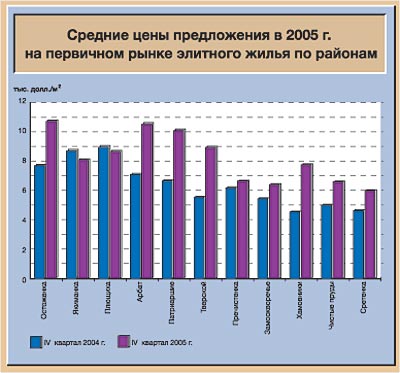 Весь прошедший год столичная недвижимость росла в цене. Самыми высокими темпами дорожали наиболее ликвидные одно-двухкомнатные квартиры в хрущевках. Но подорожание не обошло и элитное жилье – самое консервативное на рынке. По данным международной консалтинговой компании Knight Frank, общий рост цен на первичном рынке элитного жилья за год составил 28,12%, а на вторичном – 21,07%. Примерно такие же данные приводят и эксперты компании «ДОН-Строй». «Рост цен в 2005 году в классах «бизнес» и «премиум» составил около 15%, цена на предложение в классе «де люкс» возросла на 25%», – уточняет руководитель отдела по работе со СМИ компании «ДОН-Строй» Екатерина Вертячих. Лидерами роста стали Остоженка, Хамовники и Патриаршие пруды. Средняя цена квадратного метра жилья в районе Остоженки или Пречистенки в прошлом году на вторичном рынке составила 11 687 долларов.
