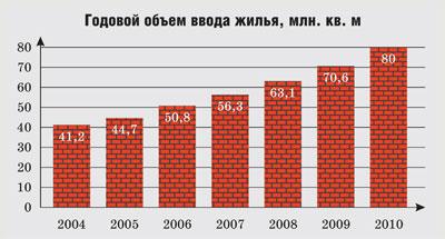 80 млн. кв. м — годовой объем ввода жилья (в 2004 году — 41,2 млн. кв. м);