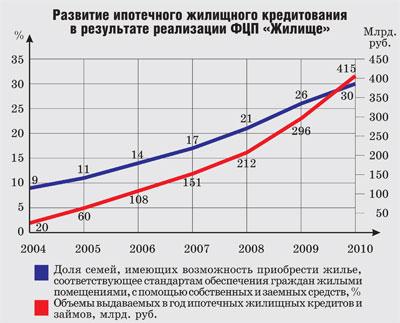 415 млрд. рублей — объем выдаваемых гражданам ипотечных жилищных кредитов и займов в год (в 2004 году — 20 млрд. рублей);