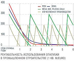 Применение опалубки европейского производства, несмотря на высокую стоимость оборудования, оправдано по нескольким причинам. Она позволяет получить ровные и гладкие поверхности монолитных конструкций, которые не требуют (или почти не требуют) доработки. В экономике строительных работ это важно, поскольку смеси, применяемые при выравнивании стен, стоят чуть ли не на порядок дороже, чем собственно бетон. Другое, не менее существенное преимущество европейской опалубки – гораздо больший в сравнении с российской срок службы оборудования. По словам специалистов компании Doka, отечественная опалубка работает обычно в течение двух лет, после этого времени оборудование может "повести", и оно потребует замены. Европейскую опалубку можно использовать без ущерба для качества строительства в течение шести-восьми лет.