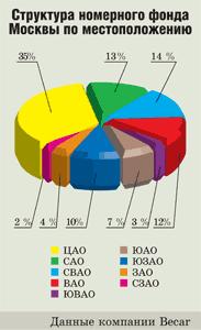В середине декабря 2005 года в Первопрестольной насчитывалось 156 гостиниц различных категорий с совокупным номерным фондом 34,307 тыс. (около 66 тыс. мест). По числу мест на 1 тыс. человек Москва значительно отстает от Европы: коэффициент насыщения в столице России 6,3, в Европе 25–26. В настоящий момент активно продолжают реконструкцию бывших советских гостиниц и строят новые. Значительное число объектов, заявленных к вводу до конца 2005 года, возведут лишь в текущем году.