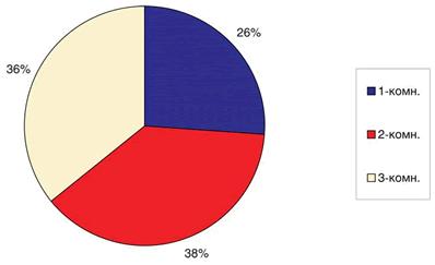 Подтверждением того, что наиболее активный спрос фокусируется на сегменте максимально дешевого жилья, является и динамика изменения средней цены 1 кв. м общей площади в зависимости от количества комнат. Здесь мы можем заметить значительный ценовой отрыв однокомнатных квартир: средняя стоимость 1 кв. м в них уже перевалила за 23 000 рублей. Что же касается двух- и трехкомнатных квартир, то между ними имеется приблизительный ценовой паритет, который лишь время от времени нарушается временным смещением котировок в ту или иную сторону. Однако в расстановке ценовых приоритетов важен не только спрос, но и предложение. Так, сложившаяся структура предложения такова, что однокомнатных квартир у нас в стране значительно меньше, чем двух- и трехкомнатных. Достаточно посмотреть на круговую диаграмму структуры предложения, чтобы убедиться в том, что однокомнатных квартир на треть меньше, чем, скажем, двухкомнатных. «Двушек» же немного больше, чем «трешек», но цена на них обычно все-таки выше, можно предположить, что это происходит по все той же причине большего спроса на жилье подешевле .