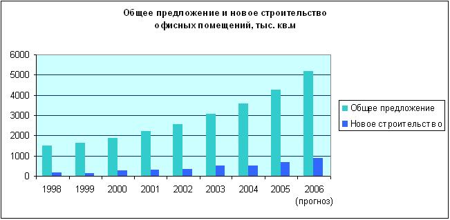 К концу 2005 года общее предложение качественных офисов составило 4,28 млн. кв.м. Таким образом, московский офисный рынок превышает по объему рынки торговых и складских помещений. Причиной этому служат столичные функции города, в котором сконцентрированы сотни тысяч компаний и проходят основные деловые контакты на международном уровне. В 2006 году прогнозируемый рост предложения составит 900 тыс. кв.м, таким образом, общий объем качественных офисных площадей достигнет приблизительно 5,2 млн. кв.м.