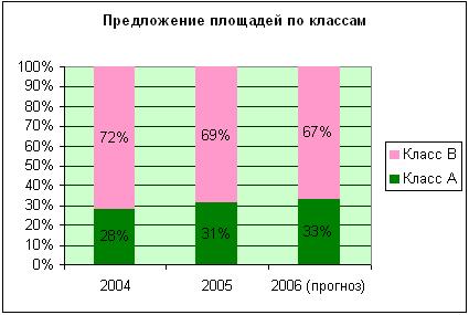 В общем предложении 31% приходится на офисы класса «А» и 69% - на офисы класса «В». Доля класса «А» повысилась на 3 процентных пункта по сравнению с 2004 годом, что объясняется вводом в эксплуатацию большого количества бизнес-центров класса «А», спрос на которые стабильно высок.